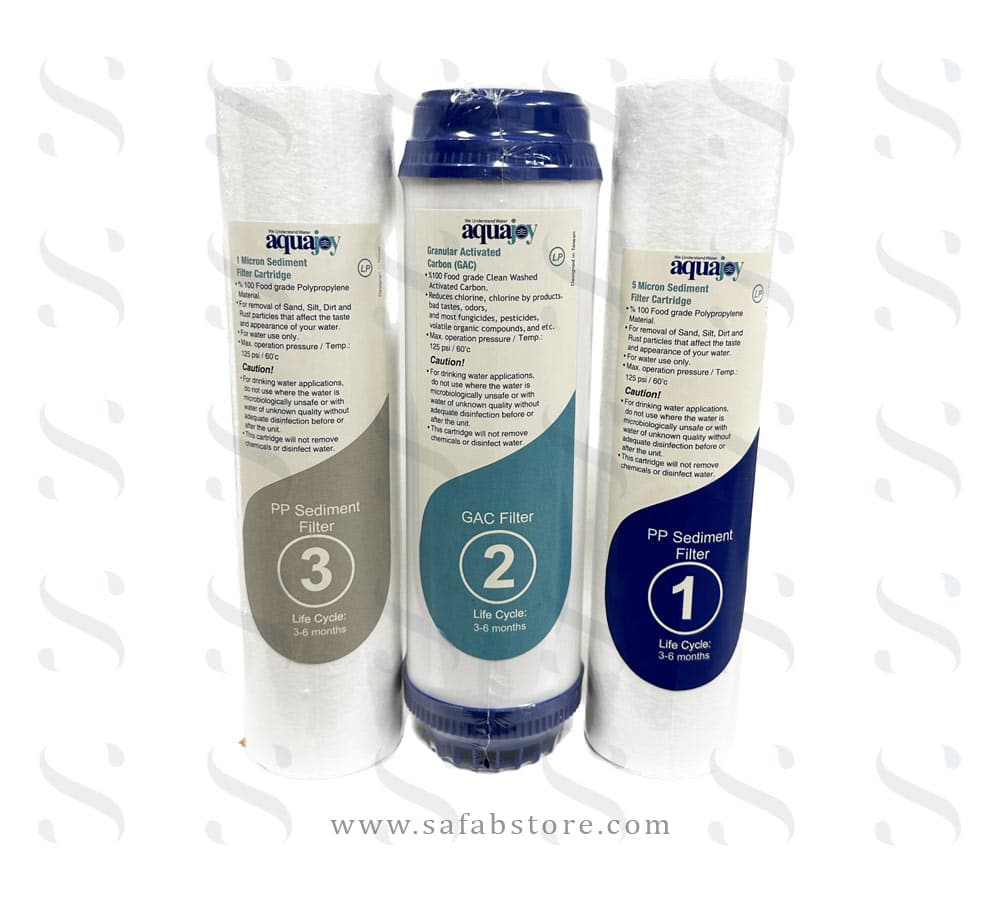 ویژگیها | پک سه عددی شامل :1-فیلتر الیافی 5 میکرون 2-فیلتر کربن فعال3-فیلتر الیافی 1 میکرون, مناسب برای دستگاه پرایم و لجند آکواجوی |